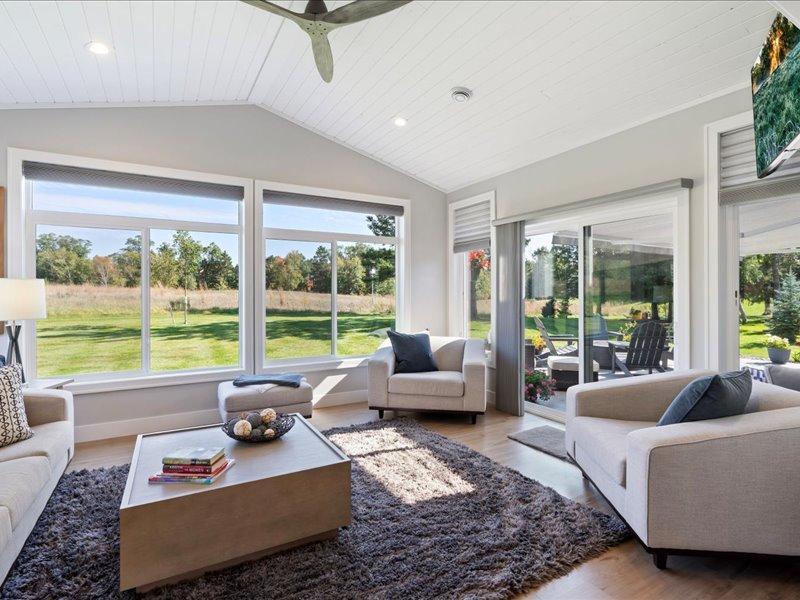 Discover turnkey elegance in the Lakes Area with this immaculately maintained 2021 home. Features include a gourmet kitchen, vaulted great room with gas fireplace, a four-season porch, three spacious bedrooms, and two bathrooms. The primary suite offers an oversized walk-in closet, and the luxurious en-suite bath with a soaking tub, tiled shower, and double granite vanity is all powered by an on-demand hot water heater. Enjoy the best of all four seasons, with heated floors throughout the home, in addition to forced air. No matter the weather, soak in panoramic views from the four-season porch. Enjoy outdoor entertaining on the stamped concrete patio with natural gas firepit and automatic awning. Take the golfcart to 100+ holes of golf! Enjoy public boat launches to Gull Lake and Sylvan Lake, paved public trails perfect for walking and biking, and the Lake's Area best dining, all within minutes! Just pack your suitcase! Inside, the home is sold fully furnished. Outside, the esteemed Cragun's Legacy Village Association takes care of all yard maintenance, including snow removal, and shoveling up to your front door. Stay connected with fiber optic internet. See what the best of Lake's Area living looks like!